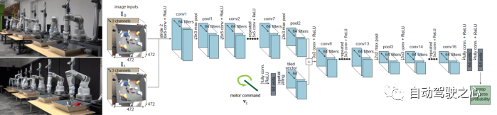 通过端到端方式实现更复杂的控制技巧学习其实早在19年谷歌就尝试过,在“Learning Hand-Eye Coordination for Robotic Grasping with Deep Learning and Large-Scale Data Collection”一文中,Sergey Levine等人即提出一种基于机器人视觉输入和执行机构控制量到多目标抓取成功率的端到端学习框架(图29),当时业内戏称“机器人农场”,实际上也取得不错的效果,后续相关的工作还有Dex-Net 1.0/2.0系列工作,但这些工作由于本身应用场景单一,数据量较小,而且不同机器人间机构、作业任务又差异很大,因此很难获得大量高质量数据以助力模型表征能力突破,影响较小,基本仅限于机器人行业从业者之间。而自动驾驶,尤其是乘用车自动驾驶,由于其具有规模极大、驾驶任务高度相似,自动驾驶车辆结构及传感器配置又比较相似,再加上资本的关注,恰恰解决了上述机器人场景的所有痛点,因此以特斯拉为代表的科技公司,才能完成数据-模型飞轮的闭环,在全社会形成广泛的影响。