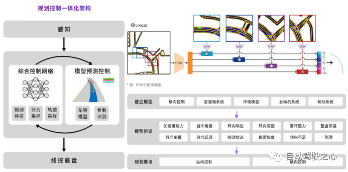 赢彻据称采用了规划控制一体化架构(图23左侧),采用基于模型控制的方法实现卡车横纵向控制,采用神经网络对交通参与者的行为进行长时预测(图23右上)。架构中也提到了通过模型辨识方法来获得车辆加速度响应、转向响应等车辆特性描述模型,规控系统在感知结果、车辆模型基础上进行车辆横向位置、纵向速度的控制。