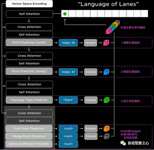在生成车道线后,在动态交互场景仍不足以支撑决策系统,如在路口处需要避让行人,在车道合并(fork)处需要执行汇车操作等,因此还需要对车道线的拓扑结构语义进行识别或预测(图19)。特斯拉对每一个车道线片段Vector序列,通过由粗略到精细的两个级联预测head预测特定功能车道线起始位置,再通过拓扑结构预测head预测当前后继车道线片段是start(起点),continue(延续点),fork(合并点),还是end(终止点),生成该车道线片段的拓扑语义描述序列即“Language of Lanes”。