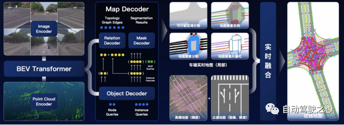 百度Apollo 团队2022年也介绍了其基于在线感知和多源地图融合的在线地图生成技术,其通过车端感知输出道路可行使区域分割、地图要素实例、地图要素分割、地图要素矢量化等结果,结合多源地图如高精地图、众源地图,实现实时在线地图实时生成,以避免高精地图更新慢、部分路段高精地图与实际不符等情况。其主要技术栈也是基于BEV Transformer方法对视觉、激光雷达输入进行特征提取,再通过基于Decoder模型学习生成相应的地图元素。