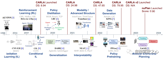 图31 端到端自动驾驶相关工作。图中按顺序列出了关键的里程碑工作,蓝色字体标识了不同类方法(Imitation Learning, Reinforcement Learning etc.)。其中代表性工作用粗体、插图进行了展示。顶部为CARLA Autonomous Driving Leaderboard中的Driving Score的评分,nuPlan Score类似。