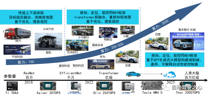 三代自动驾驶系统在之前文章已系统介绍过了(B站,ID:不优秀博仕Hanker,文章题目:三代自动驾驶系统及主流科技公司自动驾驶技术方案简介),因为总结里要分析三代自动驾驶系统的优缺点,因此这里简要回顾下三代自动驾驶系统。第一代自动驾驶技术以后融合感知技术,高精度地图,基于惯导、GPS定位系统,预测模块,基于优化、搜索的规控等组成。第二代自动驾驶技术在第一代自动驾驶方案基础上,算法框架统一为BEV框架,感知采用了基于共享主干网(share backbone)的Transformer多任务感知模型,在输出目标感知的同时,几乎所有框架也都包含Occupancy预测,同时基于本地实时地图生成方法降低了系统对高精度地图的依赖,规控部分仍以搜索和优化方法为主。第三代自动驾驶系统和第二代框架相同,均是基于BEV框架,但感知、规控算法开始采用端到端的方式,并在训练通用自动驾驶控制器的同时,利用大规模语料数据训练模型的自动驾驶场景描述能力,实现系统在输出控制量的同时解释系统为什么要执行对应的操作,即对驾驶行为进行解释。代表性工作如前文介绍的DriveGPT。第一代自动驾驶系统主要模型参数量约百万级,算力需求在100TOPS量级;第二代自动驾驶系统主要模型规模突破千万级,部分基于Transformer的模型参数量接近亿级,算力需求约200-500TOPS;第三代自动驾驶系统由于引入大模型技术,初步估算参算量会达到百亿、千亿水平,算力需求最终则会达到2000TOPS。