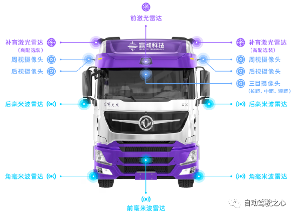 图1 赢彻自动驾驶重卡采用3激光雷达,7摄像头,5毫米波雷达(7V3L5R)传感器配置