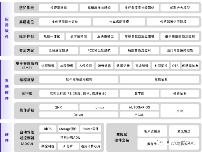 自动驾驶底层系统框架其实本质解决的问题类似,无非实现软硬件分离,算力硬件分离,以及解决各业务系统环境依赖和干扰的问题,因此其系统框架是具有共通性的,但自动驾驶应用层算法的系统架构则各家方案里区别较大,有传统的目标级后融合框架,也有当前使用最为广泛的多任务学习BEV框架,也有较为前沿的端到端或部分端到端自动驾驶框架。