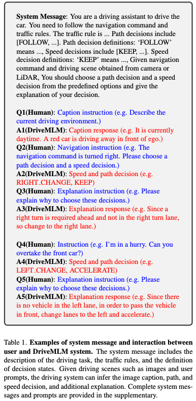 为了使语言模型能够在这些状态之间做出精确的预测,我们在语言描述和决策状态之间建立了全面的联系,如表1的系统信息所示。此相关性用作系统消息的一部分,并集成到MLLM计划器中。因此,一旦LLM描述了某些情况,预测将在决策空间内收敛为清晰的决策。每次,一个速度决策和一个路径决策被相互推断并发送到运动规划框架。在补充材料中可以找到决策状态的更详细定义。