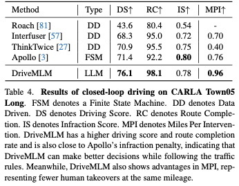 - 为了验证DriveMLM的有效性,我们不仅根据闭环驾驶指标(包括驾驶分数(DS)和每次干预里程(MPI))来评估我们的方法,还使用理解指标(包括准确性、决策状态的F1指标、决策解释的BLEU-4、CIDEr和METEOR)来评估模型的驾驶理解能力。值得注意的是,我们的方法在CARLA Town05 Long上获得了76.1 DS、0.955 MPI结果,这是4.7分,是Apollo的1.25倍。此外,我们可以通过用语言指令描述特殊要求来改变MLLM规划者的决策,如图2所示,例如为救护车或交通规则让路