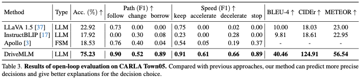 我们采用开环评估来评估驾驶知识,包括决策预测和解释预测任务。表3显示了预测决策对的准确性、决策预测的每种决策类型的F1分数,以及预测解释的BLEU-4、CIDEr和METEOR。对于Apollo,Town05上手动收集的场景将作为表3中模型的输入进行回放。回放的每个时间戳处的相应模型状态和输出被保存为用于度量计算的预测。对于其他方法,我们给他们相应的图像作为输入和适当的提示。通过将模型预测与我们手动收集的地面实况进行比较,准确性揭示了决策的正确性和与人类行为的相似性,F1分数展示了每种路径和速度决策的决策能力。DriveMLM总体上达到了最高的准确率,以40.97%的准确率超过了LLaVA。与Apollo基线相比,DriveMLM的F1得分更高,这表明它在解决各种道路情况时更有效地超越了基于规则的状态机。LLaVA、InstructionBLIP和我们提出的DriveMLM可以以问答的形式输出决策解释。在BLEU-4、CIDEr和METEOR方面,DriveMLM可以实现最高的性能,表明DriveMLM能够对决策做出最合理的解释。