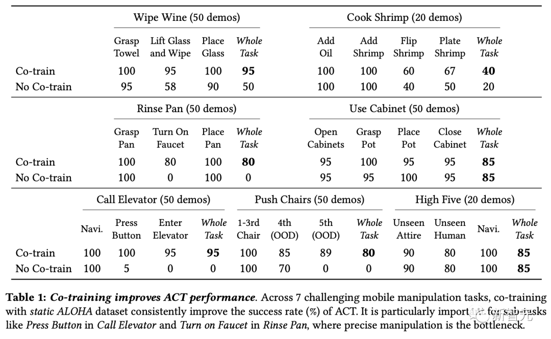 研究发现,协同训练可以提高ACT性能。在7项具有挑战性的移动操作任务中,与静态ALOHA数据集进行协同训练可持续提高ACT的成功率。