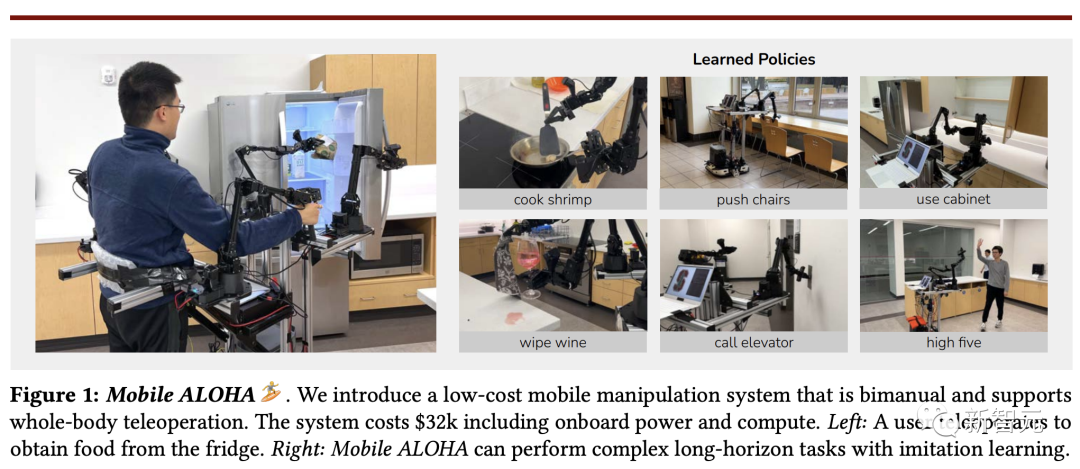 在硬件方面,作者引入了机器人Mobile ALOHA,一个低成本的全身遥操作系统,用于收集双臂移动操作数据。