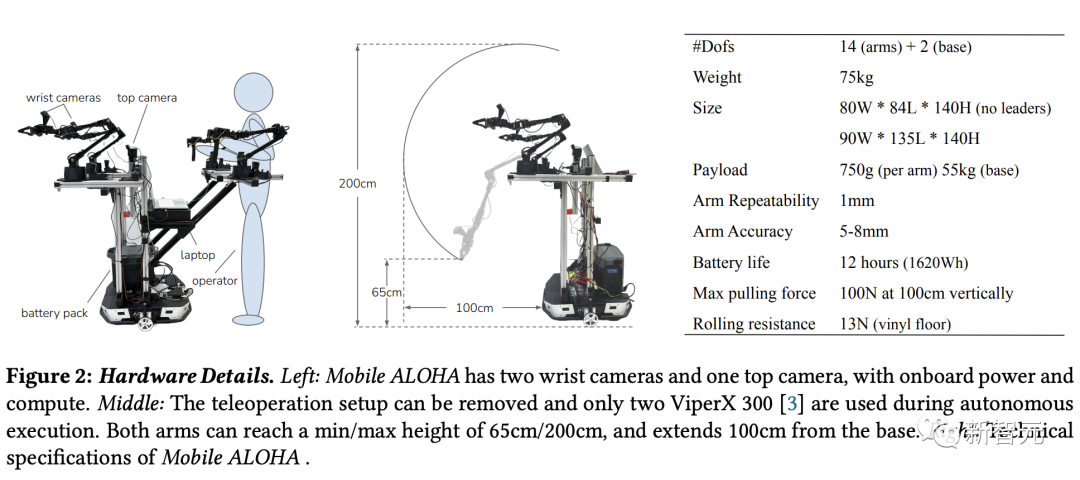 如下图所示,可以清楚地看到Mobile ALOHA的技术规格。