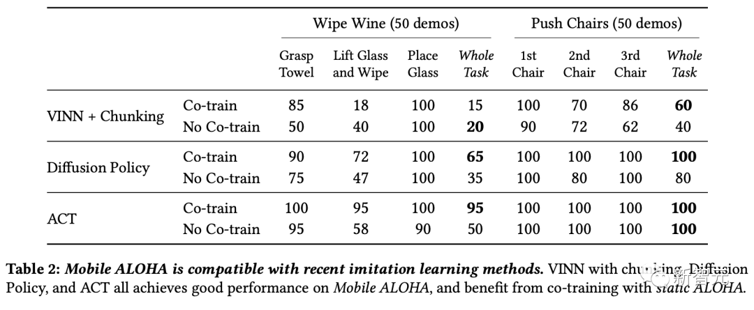 带分块的VINN、扩散策略和ACT在Mobile ALOHA上都取得了良好的性能,并且受益于与静态ALOHA的协同训练。