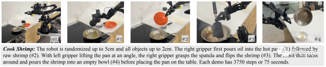 机动性和双手灵活性也是这项任务的必要条件:机器人需要从灶台移动到厨房台,用铲子翻动虾仁,而另一只手臂还需倾斜平底锅。