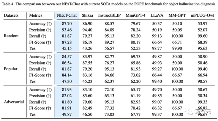 如表3所示,NExT-Chat可以在Random和Popular数据集上取得最优的准确率。