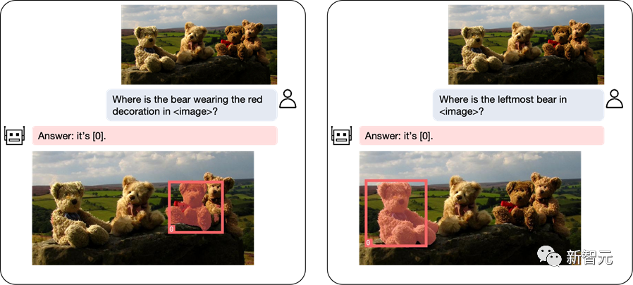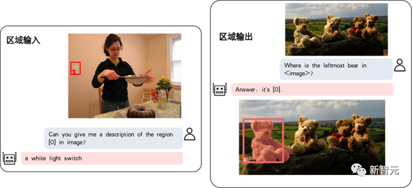 而位置输出能力指的是定位对话中提及的物体,如图1右图的小熊定位。