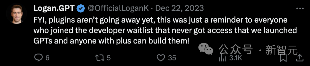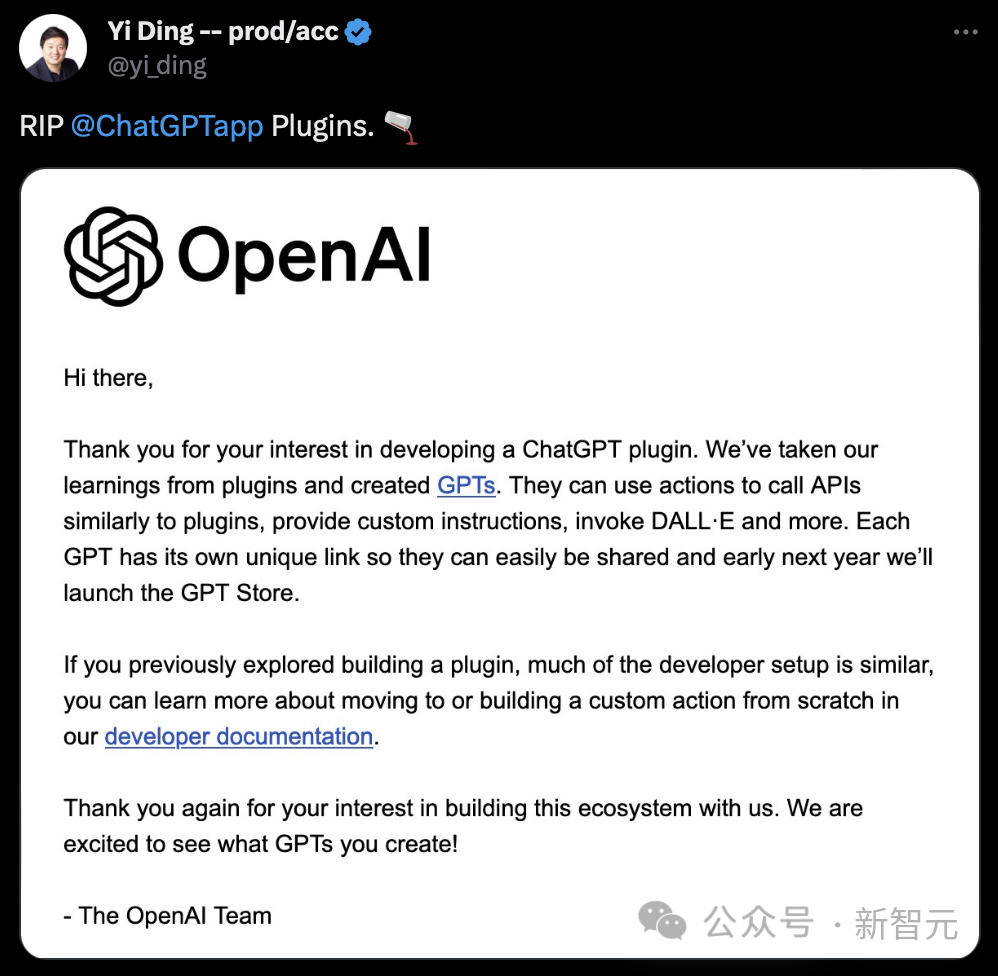 其实,早在12月左右,OpenAI已通知开发者要从「GPT插件」逐渐过渡到「自定义GPT」上。