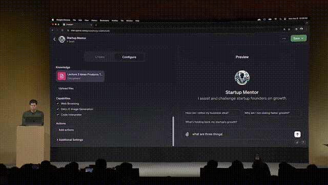 Altman本人亲自在现场登台演示,几步操作就创建了一个「创业导师GPT」,用时才3分钟不到。