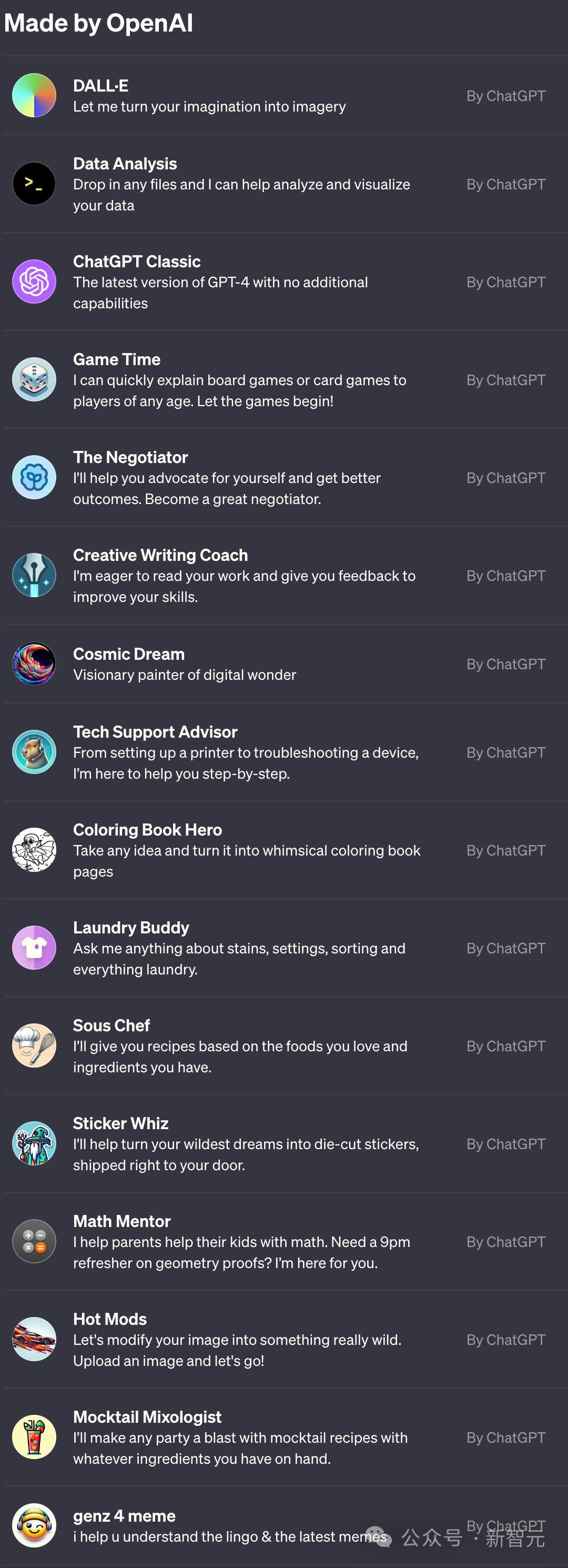 但是,「GPT商店」还上线了由OpenAI开发的16个机器人,包括数学导师、创意写作教练、助理厨师等等。