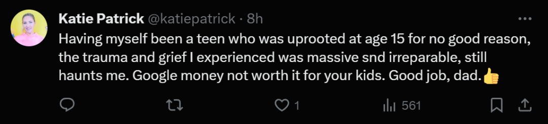 「我就曾在15岁时无缘无故背井离乡,我所经历的创伤和悲伤是无法弥补的,它们至今仍然困扰着我。谷歌的钱不值得让你的孩子受到这样的伤害。你是一位好父亲,干得好。」
