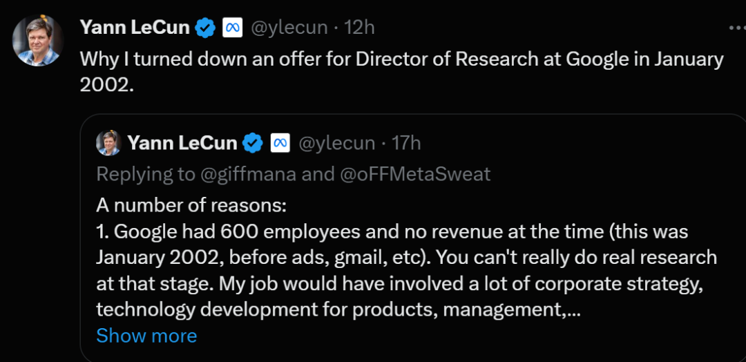 不过,考虑到若干原因,LeCun拒掉了这份offer。