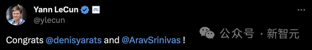 Yann LeCun对曾经在NYU读博,在FAIR工作过的CEO Denis Yarats和Aravind Sriniva表示了祝贺。