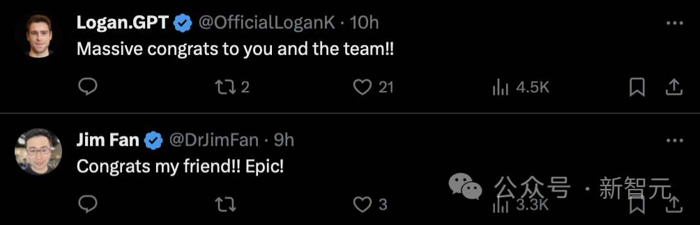OpenAI开发者负责人、英伟达科学家Jim Fan等业界大佬纷纷送上了祝贺。