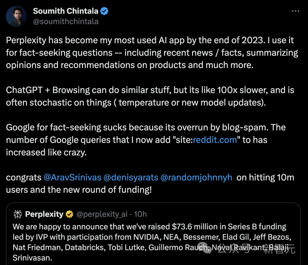 PyTorch创始人Soumith Chintala也非常看好Perplexity AI的未来,发推祝贺: