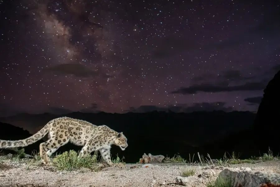 人类拍摄到的第一张雪豹在星空下漫步的照片 。