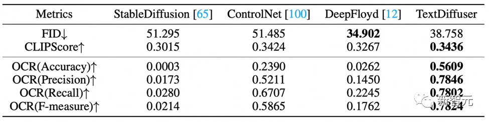 定性的实验的评估指标有FID,CLIPScore与OCR。尤其是OCR指标,TextDiffuser相对于对比方法有很大的提升。