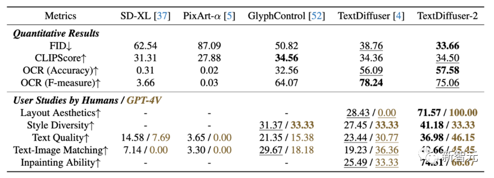 在定量实验中,TextDiffuser-2在大多数指标上具有优异的性能。