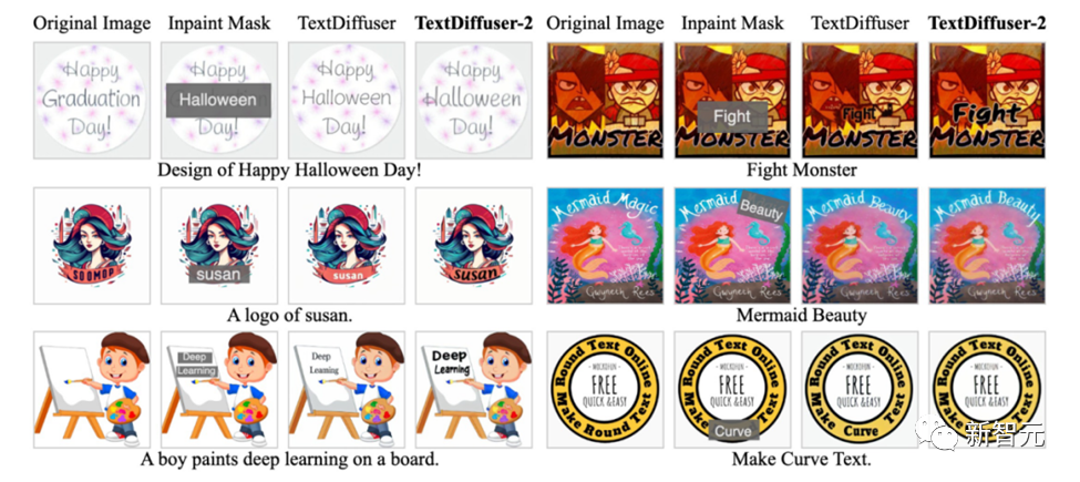 此外,在图像的文本补全(Text Inpainting)任务上,TextDiffuser-2同样展现了其优越性,能够在保持文本与背景匹配的同时,提升整体图像的质感和美观度。