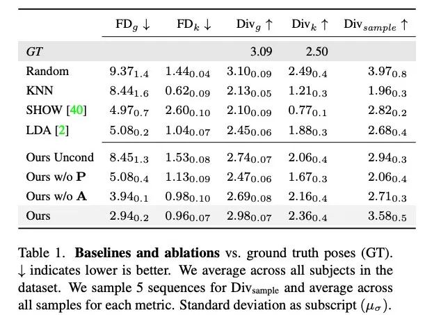 表 1 显示,与之前的研究相比,本文方法在生成多样性最高的运动时,FD 分数最低。虽然随机具有与 GT 相匹配的良好多样性,但随机片段与相应的对话动态并不匹配,导致 FD_g 较高。