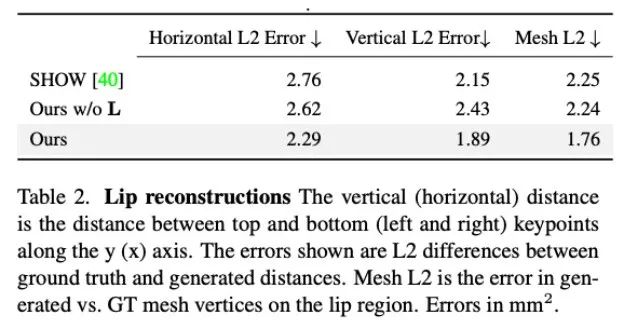 此外,研究者还分析了本文方法在生成嘴唇运动方面的准确度。如表 2 中的统计所示,Audio2Photoreal 显著优于基线方法 SHOW,以及在消融实验中移除预训练的嘴唇回归器后的表现。这一设计改善了说话时嘴形的同步问题,有效避免了不说话时口部出现随机张开和闭合的动作,使得模型能够实现更出色的的嘴唇动作重建,同时降低了面部网格顶点(网格 L2)的误差。