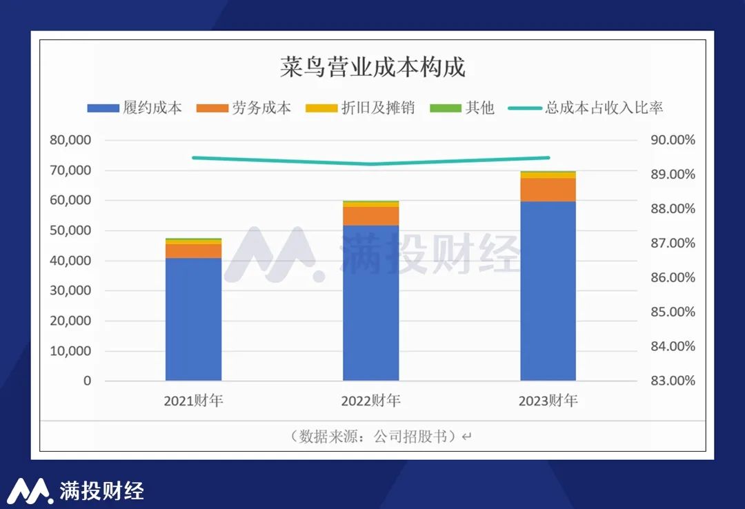 菜鸟此前的持续亏损,与高额的营业成本有关。2021至2023财年,菜鸟的营业成本分别为471.89亿元、596.86亿元和696.53亿元,占收入的比例分别达到89.5%、89.3%、89.5%,因此菜鸟的整体毛利率分别为10.5%、10.7%和10.5%。