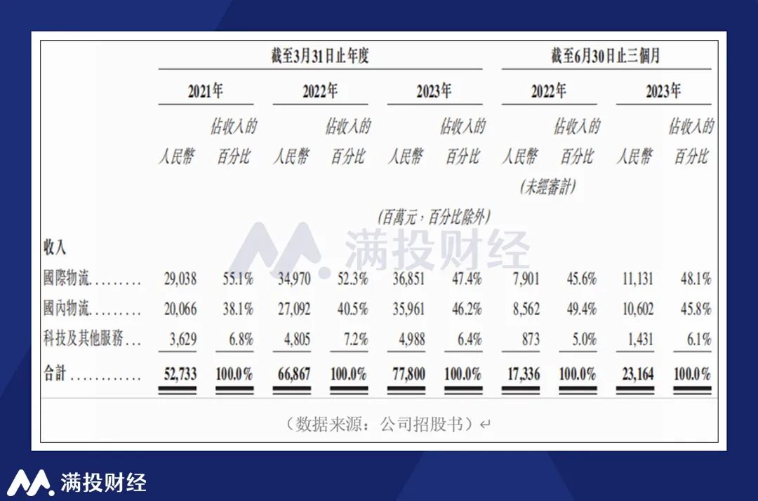 先来看菜鸟的收入情况,截至3月31日的2021年、2022年及2023年财年(下文如是),菜鸟分别实现收入527.33亿元、668.67亿元和778.00亿元,年复合增长率为21%。截至2023年6月30日止三个月的收入为231.64亿元,较2022年同期增长34%。