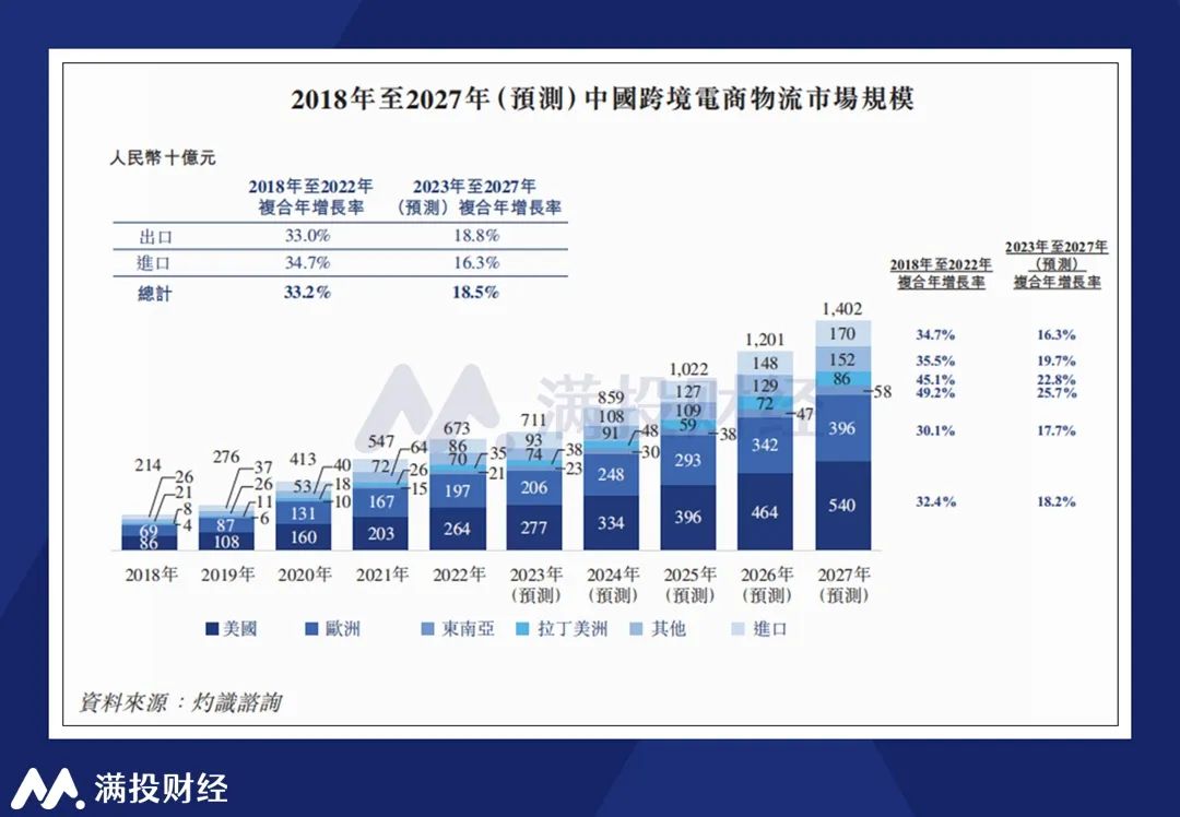 做跨境物流,跨境电商正在成为全球物流电商扩展的新动力,预计2017年至2023年的复合增长率将达到18.7%,占整体市场增量的49.6%。而中国已经是全球跨境电商物流市场的最大组成部分和主要增长动力,预计到2027年对全球跨境电商物流市场的贡献将达到60.8%。这也是众多国内物流厂商竞争的新方向。