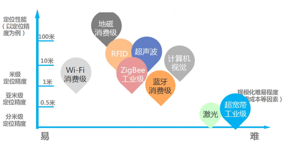 根据《指南》对于精度的要求,人员聚集模型所需的数据采集间隔不大于10秒,延时不超过55秒,模型计算周期不大于30秒,定位精度误差不大于5米。这些要求也促进了相应的方案进行技术创新和改进。对常见技术定位精度和规模化难易程度比较如下图所示,无疑,工业级超宽带和激光雷达将引领高端的室内定位市场。