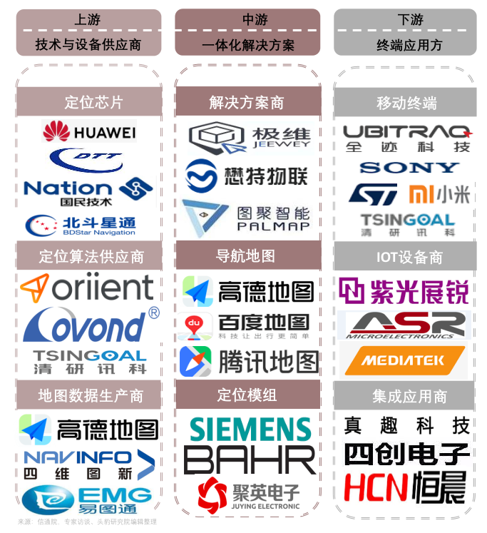 当前,室内定位产业链上游为技术与设备供应商,提供定位芯片、定位算法以及地图相关数据;中游为一体化解决方案提供解决方案和导航、定位模组等等;下游为终端应用方,提供移动终端、IOT设备、集成方案等等。典型企业展示如下图所示: