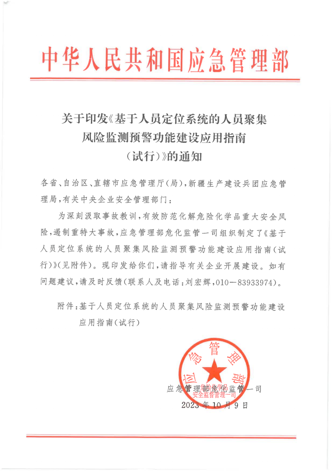 2023年10月,应急管理部印发《基于人员定位系统的人员聚集风险监测预警建设应用指南(试行)》,要求危化企业在建设人员定位系统基础上,对照指南要求,进一步提升人员定位精度,开发聚集预警模型算法,强化人员聚集风险管控,持续优化升级安全风险智能化管控平台相关模块,切实防控高危区域现场人员聚集风险。