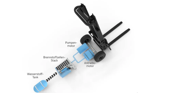 用于叉车和仓库设备的氢驱动装置的核心是燃料电池系统,由燃料电池堆、氢气罐(350 巴)、小型锂离子电池形式的储能装置和风扇组成。电池用于临时储存不需要的能量或通过能量回收获得的能量,以便在高峰负荷时能迅速恢复使用。该系统设计成一个与传统铅酸电池大小相当的铸件框架,只需稍加改动,就能相对容易地安装在传统电动叉车上。