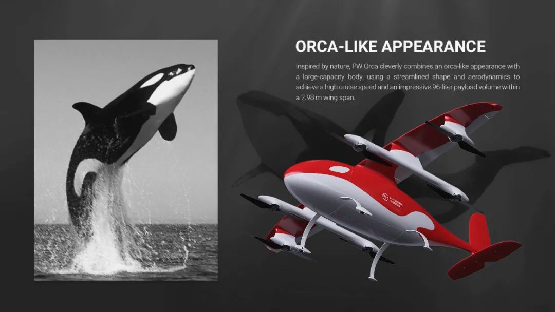 PW.Orca是一款专为低空物流场景设计的垂起固定翼物流无人机,设计灵感来源于大自然,巧妙地将大载货量的体型与虎鲸元素融合,同时结合虎鲸流线型的形态和空气动力学,在小于3m的翼展内,实现96 升、15公斤的大载荷。