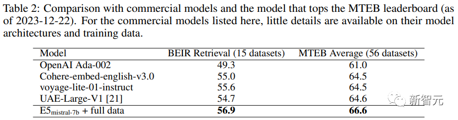 下表中可以看到,文中得到的模型「E5mistral-7B + full data」在MTEB基准测试中获得了最高的平均分,比之前最先进的模型高出2.4分。