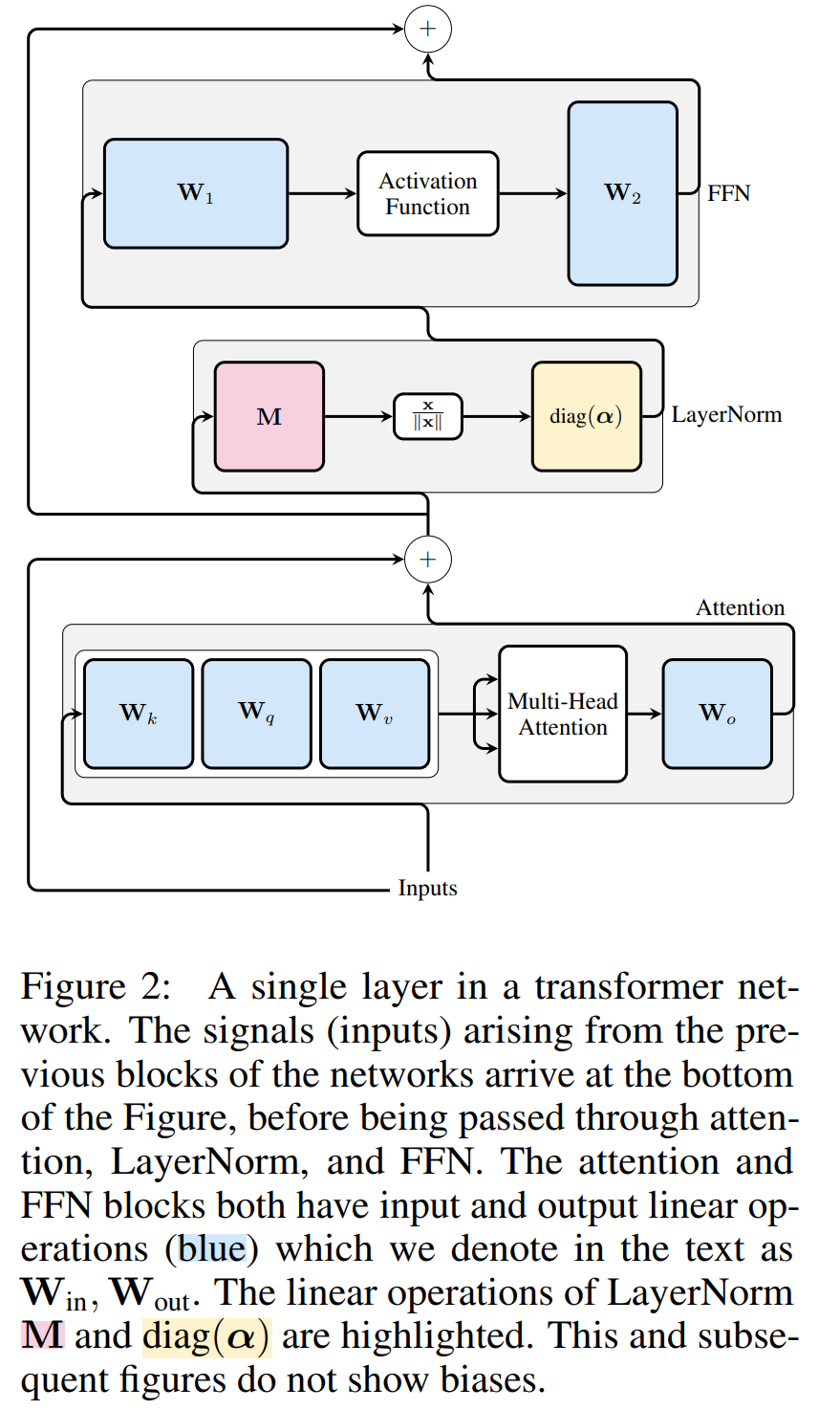 图 3 显示了 Transformer 网络(见图 2)的这种转换。在每个区块中,作者将输出矩阵 W_out 与均值减法矩阵 M 相乘,后者考虑了后续 LayerNorm 中的均值减法。输入矩阵 W_in 被前面 LayerNorm 块的比例预乘。嵌入矩阵 W_embd 必须进行均值减法,而 W_head 必须按照最后一个 LayerNorm 的比例重新缩放。这只是运算顺序的简单改变,不会影响网络输出。