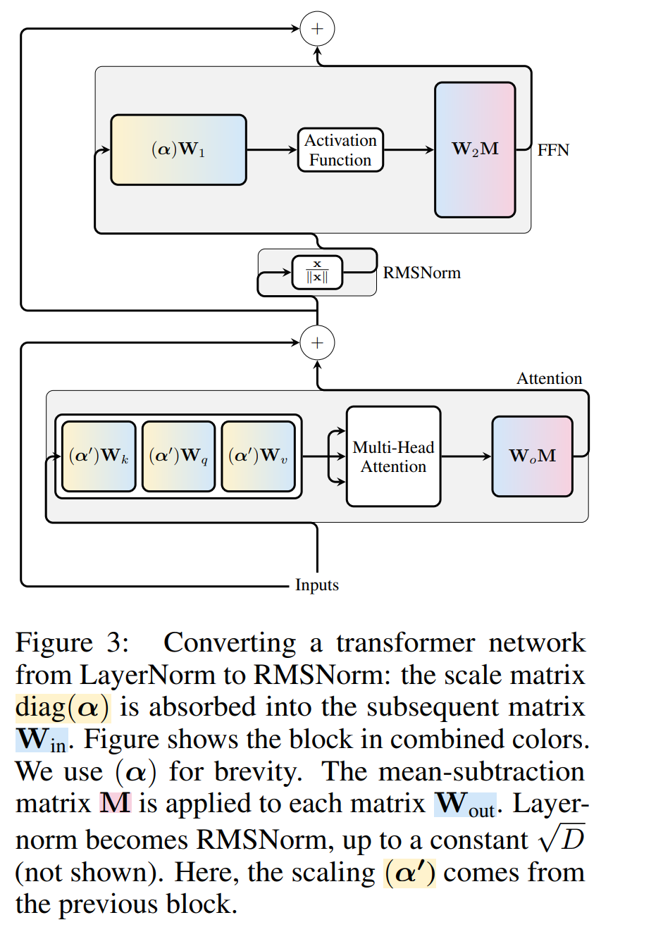 Transformer 网络的计算不变性仅适用于 RMSNorm 连接的网络。在处理使用 LayerNorm 的网络之前,作者先将 LayerNorm 的线性块吸收到相邻块中,从而将网络转换为 RMSNorm。