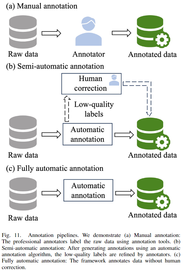 不同的自动驾驶任务需要特定类型的标注。例如,目标检测需要实例的边界框标签,分割基于像素或点级别的标注,对于轨迹预测来说,标注连续的轨迹至关重要。另一方面,如下图11所示,标注流程可以分为三种类型:手动标注、半自动标注和全自动标注。在本节详细说明了不同类型标注的标注方法。
