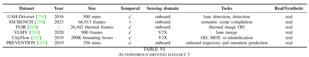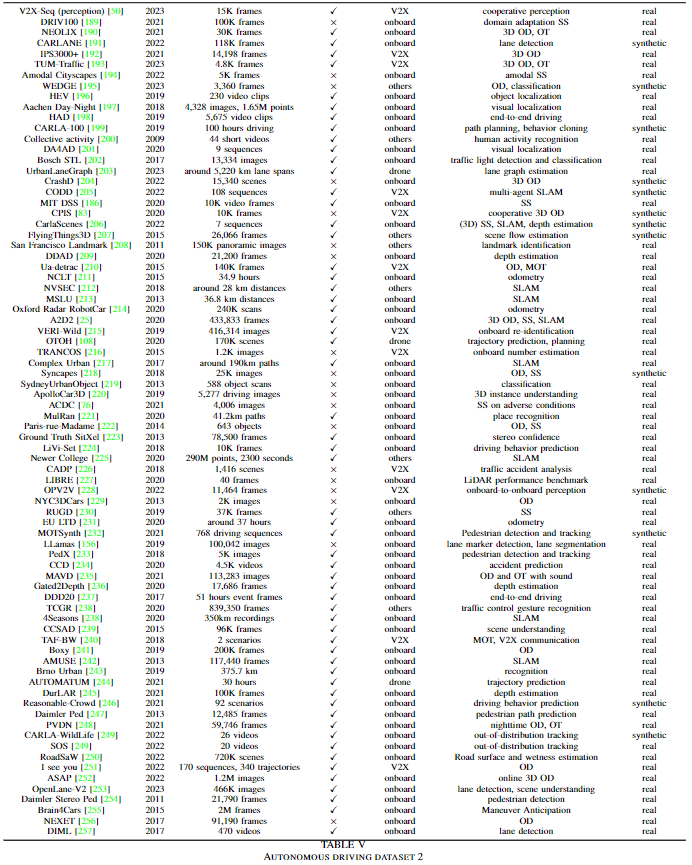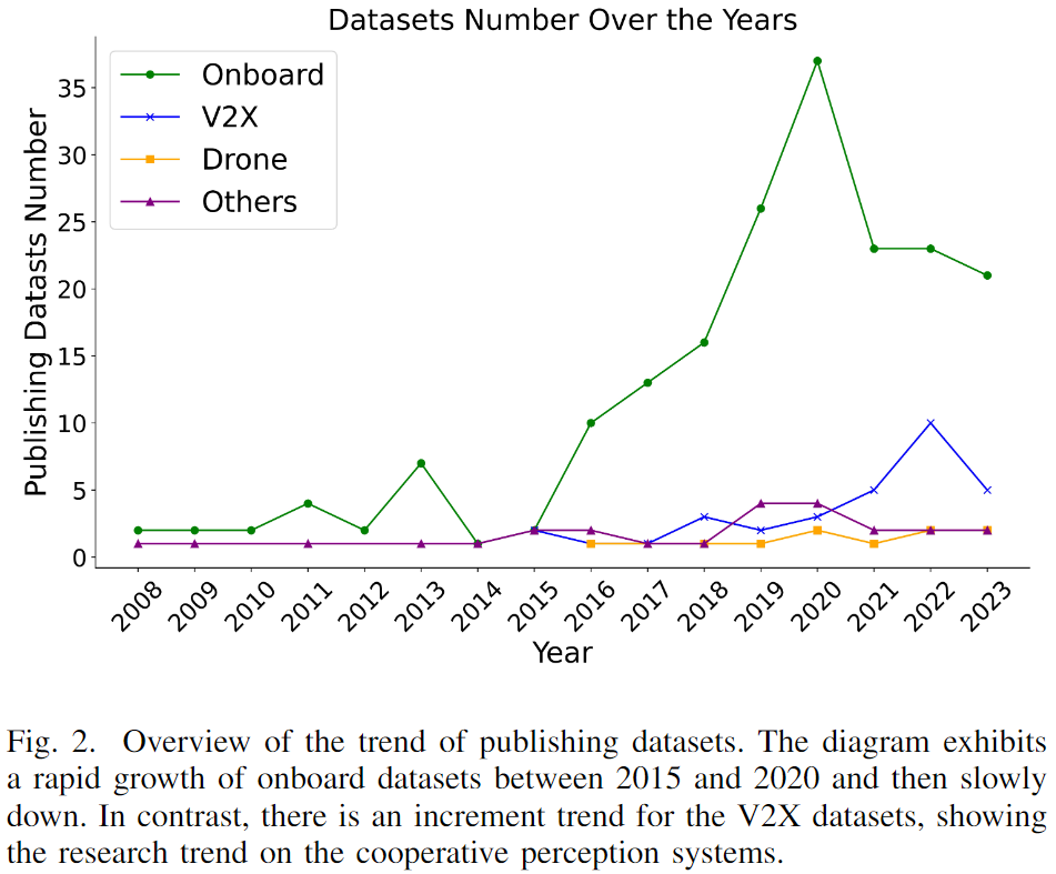 总体而言,由于自动驾驶汽车有效而准确地感知周围环境的能力的重要性,大多数数据集提供了来自装备在自车上的传感器的感知视角(车载)。另一方面,由于实际世界数据成本高昂,一些研究人员提出了高影响力的合成数据集,如VirtualKITTI (2016年),以减轻对实际数据的依赖。在仿真器的有效性的推动下,近年来发布了许多新颖的合成数据集。在时间线上,像DAIR-V2X (2021年)这样的V2X数据集也呈现出向合作驾驶系统的趋势。此外,由于无人机提供的非遮挡视角,基于无人机的数据集,如2018年发布的UAVDT ,在推动感知系统方面发挥着关键作用。
