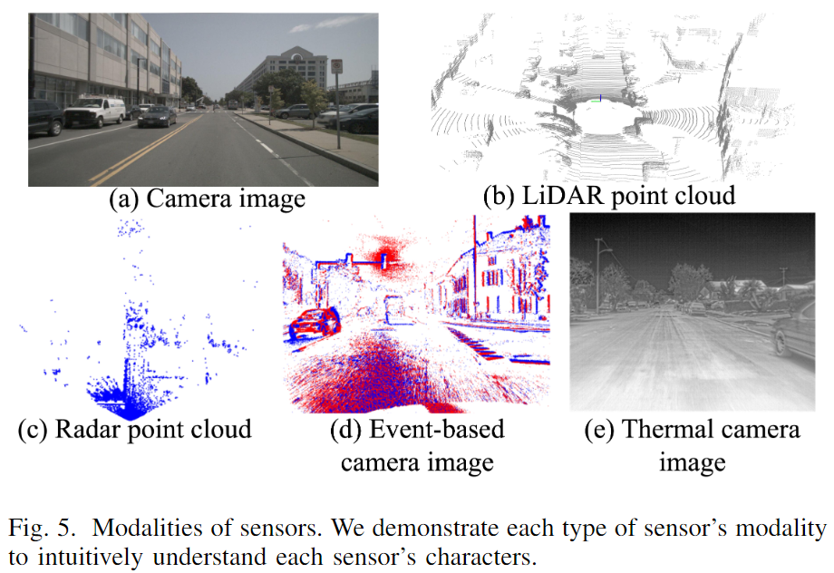 热成像相机的红外图像。热成像相机(见下图 5 (e))通过捕捉红外辐射来检测热特征 。由于基于温差生成图像,热成像相机可以在完全黑暗中工作,并且不受雾或烟影响。然而,热成像相机无法分辨颜色或详细的视觉图案。此外,与光学相机相比,红外图像的分辨率较低。