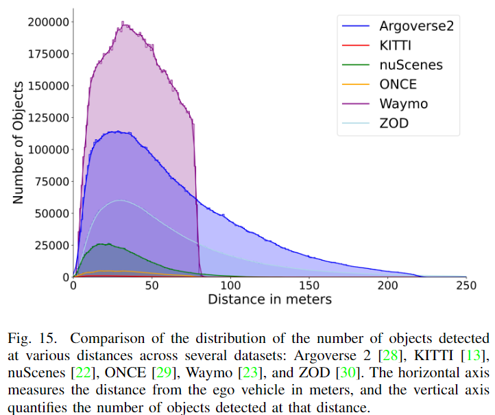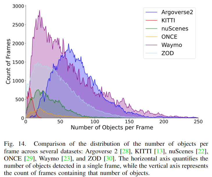 在图14中介绍了这些数据集每帧目标数量的情况。值得注意的是,Waymo 展示了大量帧数少于50个目标的情况,同时在图表中占据了广泛的位置,说明了它在每帧中从低到高的目标密度涵盖了各种场景。相反,KITTI 展示了一个更为受限的分布和有限的数据规模。Argoverse 2 具有大量帧数的高目标计数,其峰值约为70,这表明了它在一般情况下复杂的环境表示。对于 ONCE ,其目标密度均匀地分布在支持的感知范围内。像 nuScenes 和 ZOD 这样的数据集展示了类似的曲线,快速上升然后缓慢下降,暗示了环境复杂性的适度水平,每帧中目标数量具有相当的可变性。