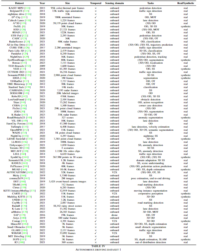 因此,本文的目标是提出一项全面而系统的研究,涵盖自动驾驶中的大量数据集,从感知到控制的所有任务,考虑真实世界和合成数据,并深入了解若干关键数据集的数据模态和质量。在下表I中对比了其他数据集调查和作者的调查。