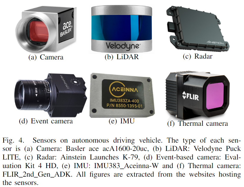 高效而准确地从周围环境中收集数据是自动驾驶可靠感知系统的关键。为了实现这一目标,在自动驾驶车辆和基础设施上使用了各种类型的传感器。传感器的示例如下图 4 所示。最常用的传感器是相机、LiDAR 和Radar。事件型和热成像相机也安装在车辆或道路旁边,以进一步提高感知能力。
