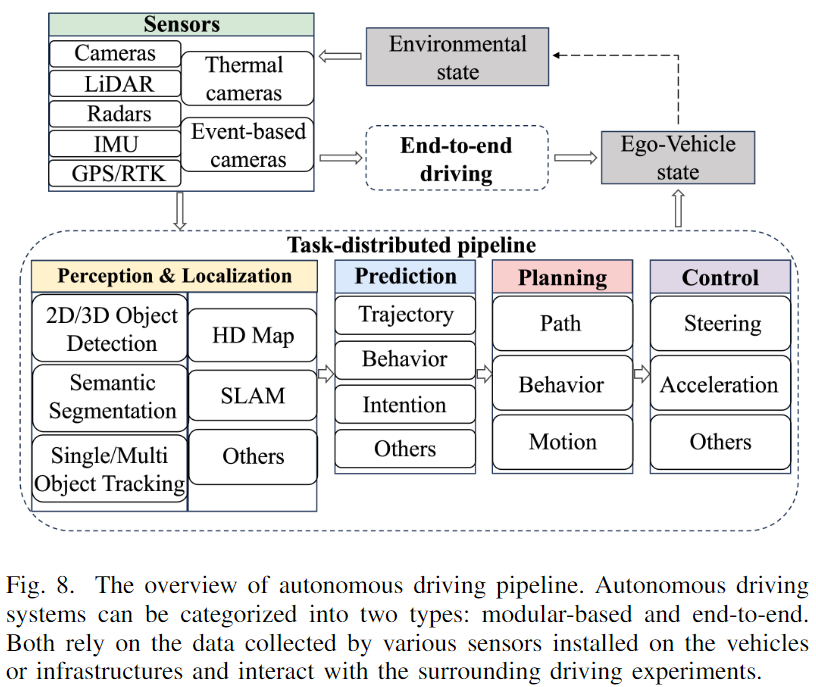 这一部分深入介绍了自动驾驶中的关键任务,如感知和定位、预测以及规划和控制。自动驾驶流程的概览如下图8所示。详细说明它们的目标、它们所依赖的数据的性质以及固有的挑战。图9展示了自动驾驶中若干主要任务的示例。